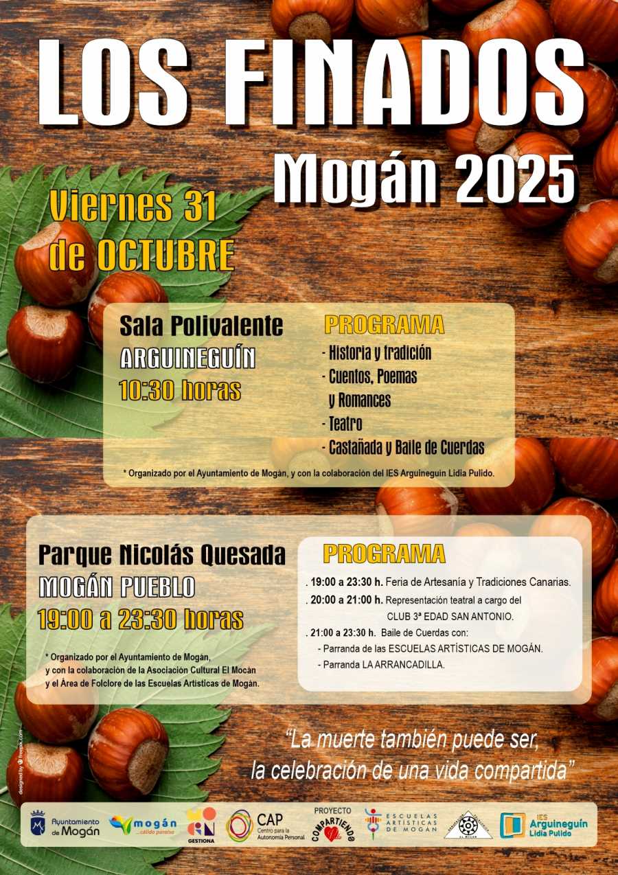 El objetivo es dar a conocer las tradiciones del Archipiélago en torno al culto a los difuntos, rendir homenaje a las ya personas ausentes y contribuir a naturalizar la muerte como parte de la vida. Para ello se proyectará un vídeo, se narrarán romances y cuentos, siendo uno de estos musicado con timple, se presentará el nuevo espectáculo de los Mayores de Teatro '¿Pero a qué escuela me mandaron?', se guardará un minuto de silencio en recuerdo de los difuntos, tendrá lugar un Baile de Cuerdas en el que además participan las Escuelas Artísticas de Mogán, y castañada.