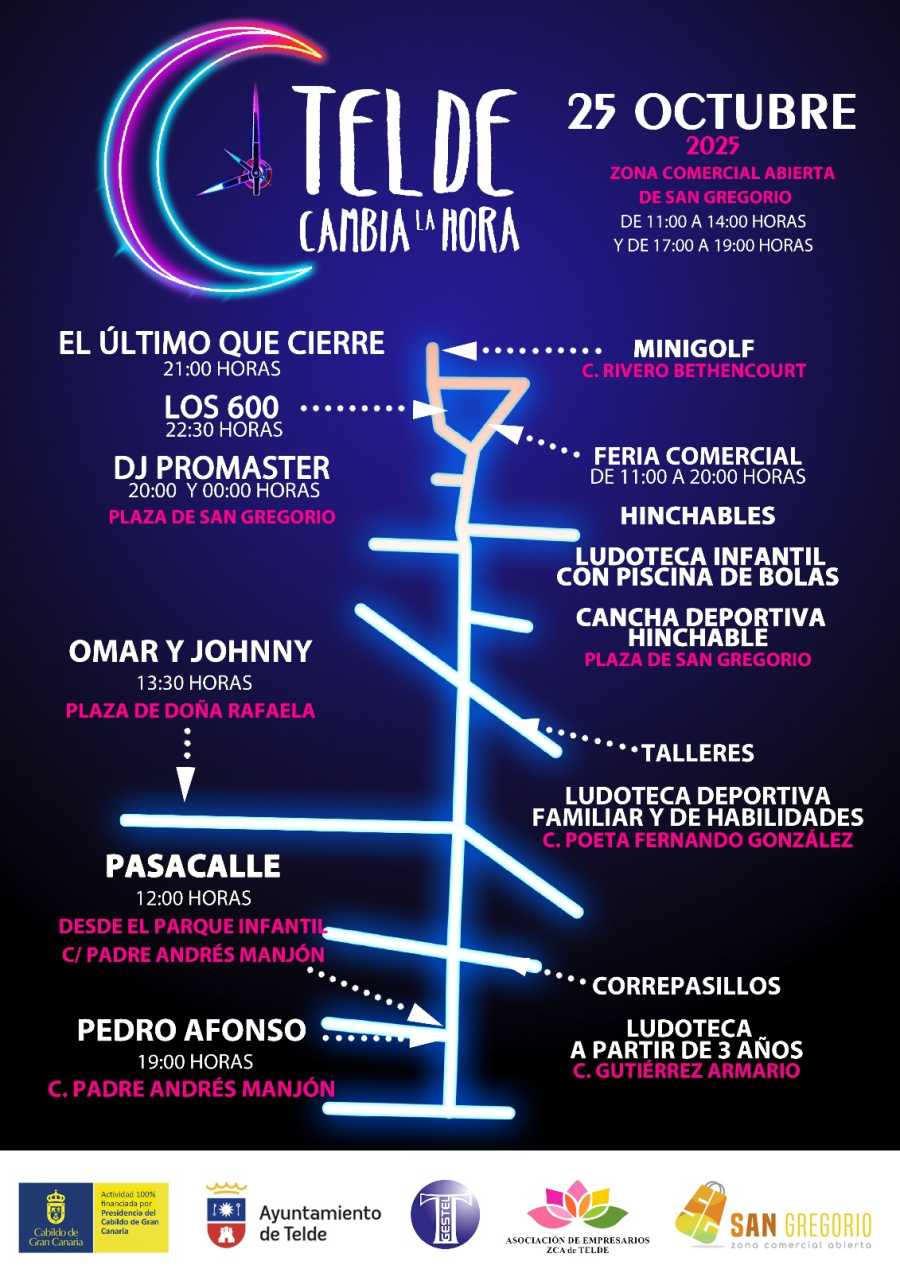 Telde, a 23 de octubre de 2024. El Ayuntamiento de Telde, mediante la Concejalía de Desarrollo Local, que dirige Nayra Navarro, anuncia una nueva edición de Telde cambia la Hora. La ciudad celebrará el nuevo cambio horario con una feria comercial y un cargado programa de actividades para toda la familia en la Zona Comercial Abierta (ZCA) de San Gregorio. Este proyecto está subvencionado en su totalidad por la Consejería de Presidencia del Cabildo de Gran Canaria, que dirige Teodoro Sosa, por lo que no supone ningún coste para las arcas municipales.