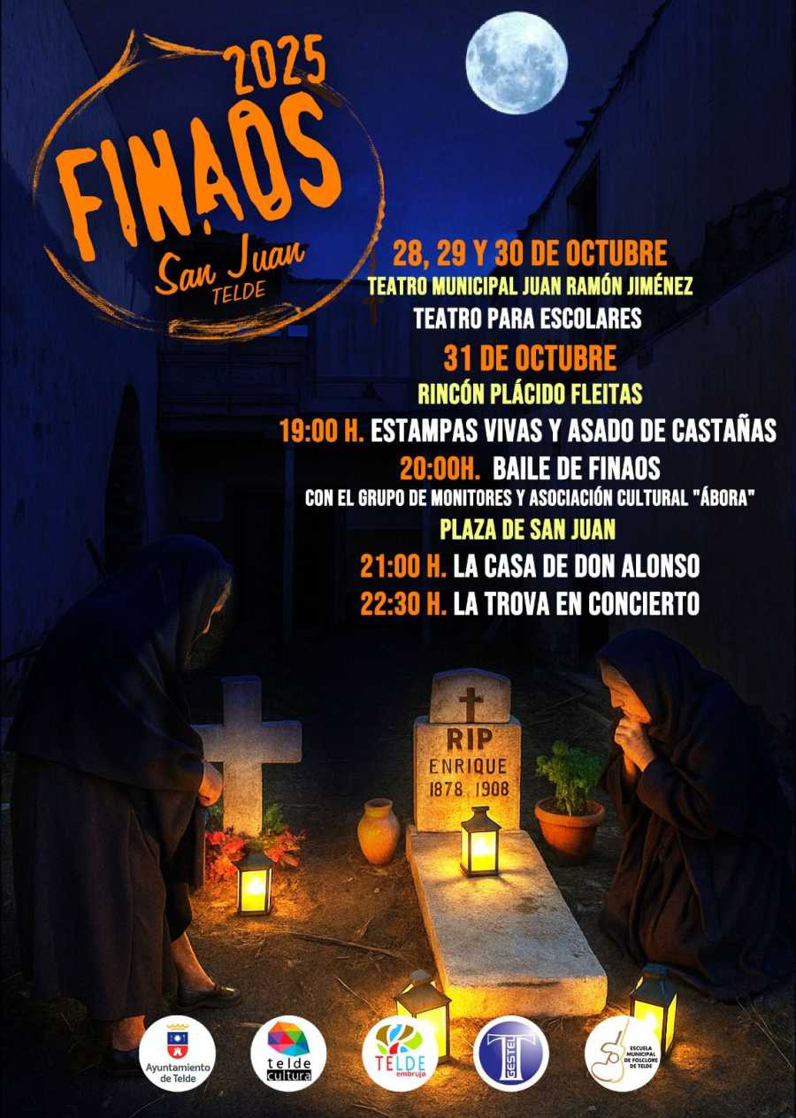 Este 28, 29 y 30 de octubre, el Teatro Municipal Juan Ramón Jiménez acoge funciones teatrales para escolares, a cargo de la Escuela Municipal de Folclore de Telde, para mostrar a los más jóvenes cómo las generaciones pasadas vivían los Finaos. Más de una decena de centros educativos del municipio serán partícipes en estas jornadas, con más de 1.150 alumnos que pasarán durante estos días por la sala de la Casa de la Cultura.