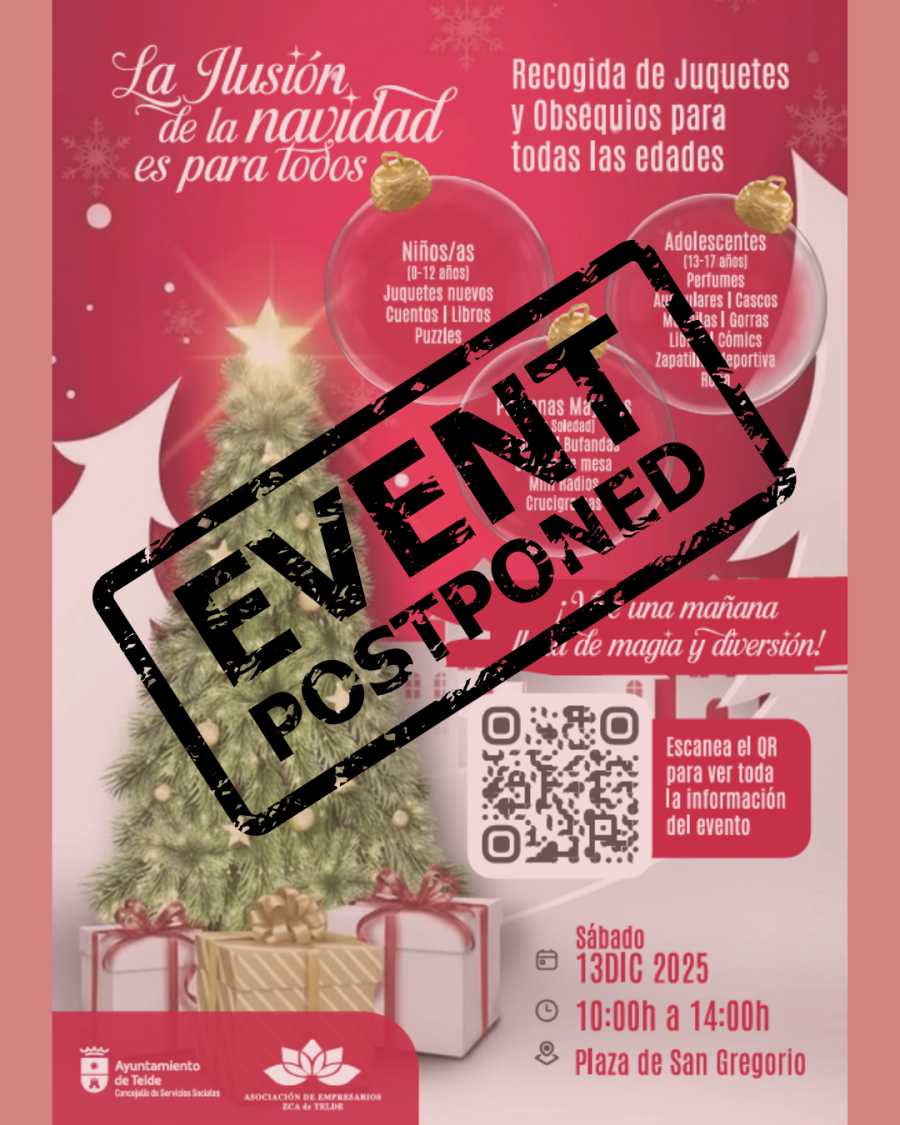 Telde, a 12 de diciembre de 2025. El Ayuntamiento de Telde comunica a la ciudadanía el aplazamiento de la celebración de la gran recogida solidaria de juguetes, que se tenía previsto para este sábado, debido a la situación de alerta por fenómenos meteorológicos adversos en toda Canarias, declarada por la Dirección General de Emergencias del Gobierno de Canarias, para hoy viernes y mañana.