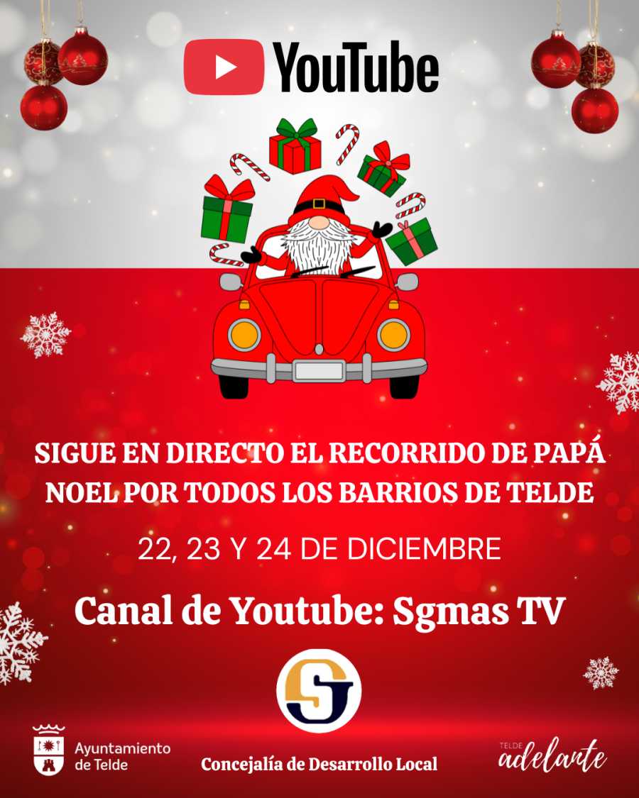 Telde, a 19 de diciembre de 2025. El Ayuntamiento de Telde llevará la magia a los hogares con la retransmisión en directo —visible desde cualquier parte del mundo— del recorrido de Papá Noel por todos los barrios del municipio los próximos 22, 23 y 24 de diciembre. Tres jornadas maratonianas que llenarán las calles de ilusión y espíritu navideño.