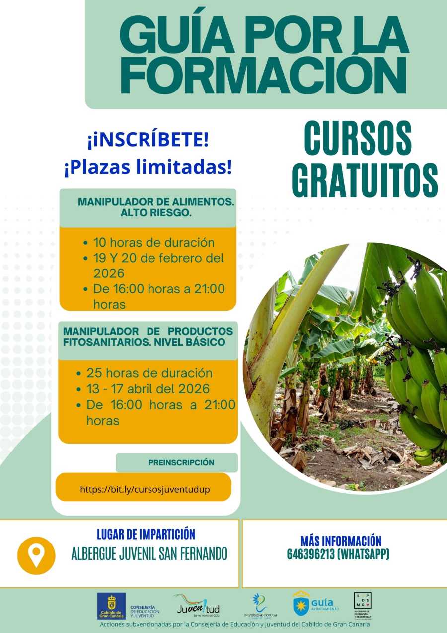 El Ayuntamiento de Guía, a través de las concejalías de Juventud y Universidad Popular, que dirige Ruth Martín, pone en marcha dos nuevos cursos gratuitos dirigidos a mejorar la formación y la empleabilidad de la ciudadanía: Manipulador de Alimentos de Alto Riesgo y Manipulador de Productos Fitosanitarios Nivel Básico.