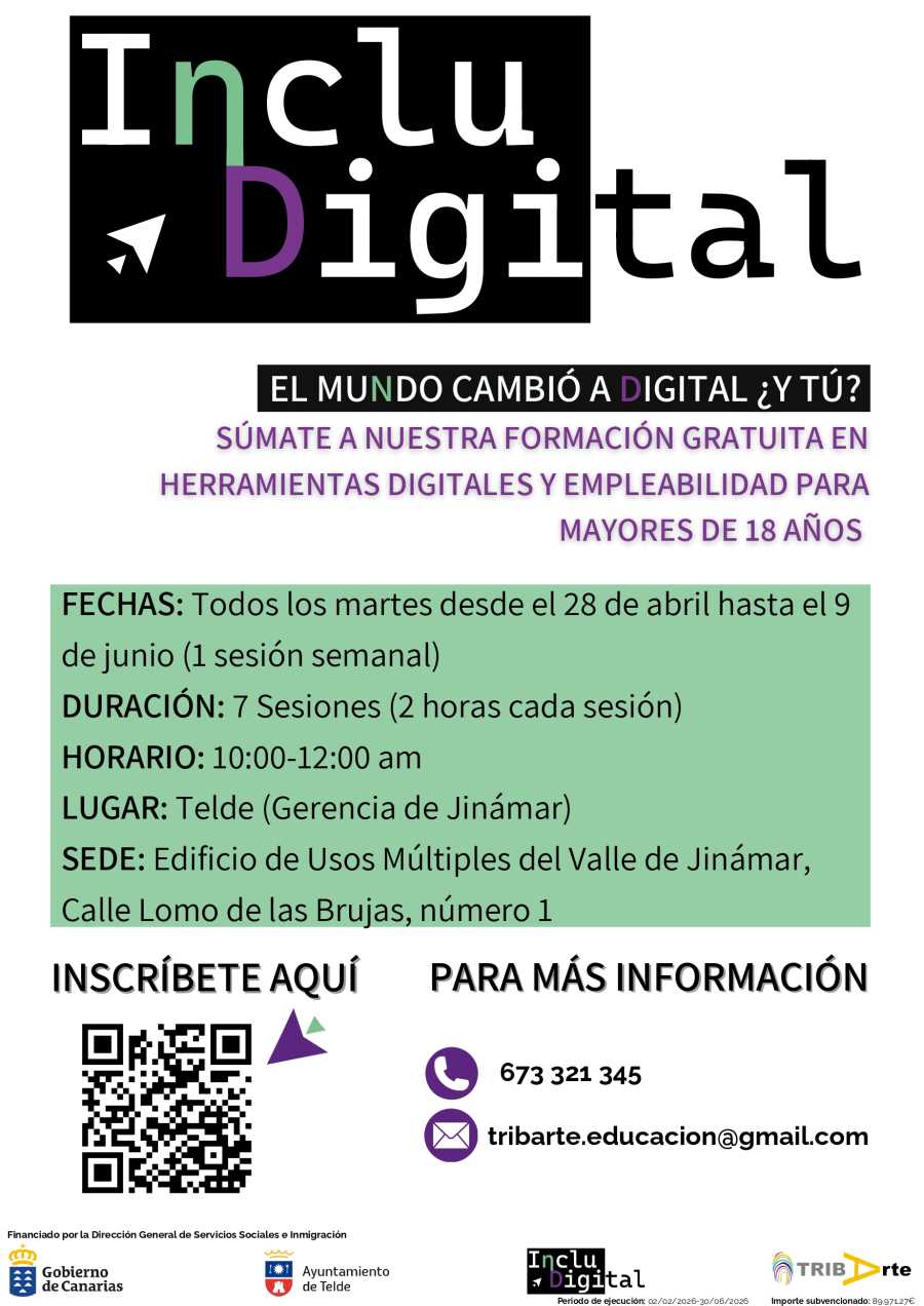El programa IncluDigital cuenta con financiación de la Dirección General de Servicios Sociales e Inmigración del Gobierno de Canarias, y las personas interesadas pueden inscribirse o solicitar más información a través del teléfono 673 321 345 o del correo electrónico Esta dirección de correo electrónico está siendo protegida contra los robots de spam. Necesita tener JavaScript habilitado para poder verlo..