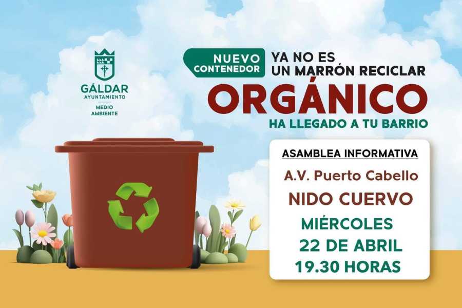 El Ayuntamiento de Gáldar continúa con el ciclo de reuniones informativas para impulsar la implantación del contenedor marrón en el municipio. La próxima cita tendrá lugar el miércoles 22 de abril a las 19:30 horas en la sede de la A.V. Puerto Cabello, Nido Cuervo, en un encuentro abierto a toda la ciudadanía.