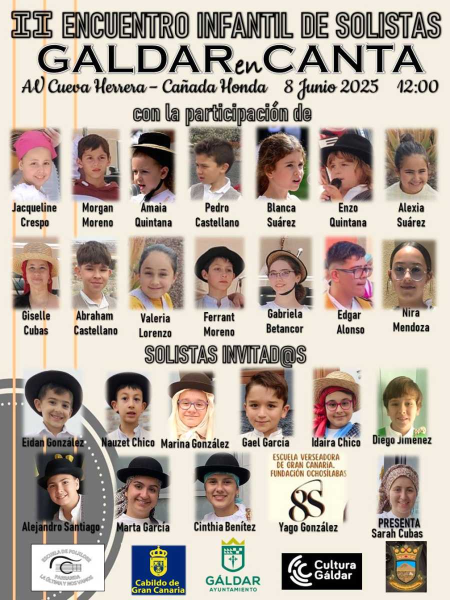 En esta ocasión serán 25 las voces infantiles y juveniles que participaran en este certamen: Jacqueline Crespo, Morgan y Ferrant Moreno, Blanca Suárez, Giselle Cubas, Amaia y Enzo Quintana, Alexia Suárez, Valeria Lorenzo, Pedro y Abraham Castellano, Gabriela Betancor, Edgar Alonso y Nira Mendoza... A estas se le suman como invitados especiales: Eidan Gonzalez, Nauzet e Idaira Chico, Diego Jiménez, Gael García, Alejandro Santiago y Yago González, este último miembro de la escuela Verseadora de Gran Canaria y de la fundación Ocho sílabas. Además nuestro instrumento canario por excelencia, el timple tendrá su espacio con la participación de Marina González, Marta García y Cinthia Benitez.