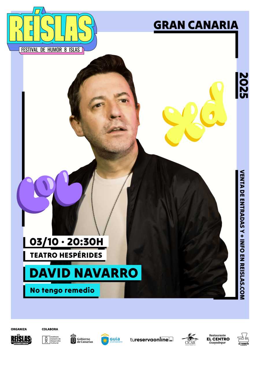 El cómico David Navarro presenta este viernes 3 en el Teatro Hespérides de Guía su espectáculo 'No tengo remedio' dentro de la tercera edición del Festival Reílas que recorre el Archipiélago con los mejores humoristas del panorama nacional. Tras el arrollador éxito del show de Jorge Ávila en el Hespérides de Guía el pasado 12 de septiembre, llega ahora al municipio una nueva propuesta dentro de este Festival de Humor que ha roto todos los registros de taquilla este año en el que su programación ha alcanzado a las ocho islas. El alcalde, Alfredo Gonçalves Ferreira, ha destacado la excelente acogida de la que disfrutan los espectáculos “de calidad y pensados para todos los públicos que traemos al municipio, con propuestas nuevas, diferentes, para disfrutar y compartir e intentando siempre que sean del agrado del mayor número de personas”, señaló.