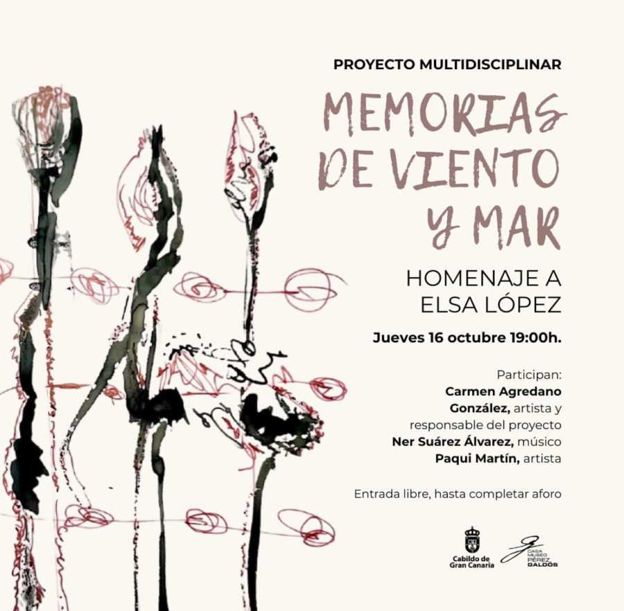Las Palmas de Gran Canaria, 14 de octubre de 2025- La Casa-Museo Pérez Galdós presenta el día 16 de octubre, a las 19:00 horas, el proyecto multidisciplinar ‘Memorias de viento y mar’, una iniciativa artística dirigida por Carmen Agredano González, que rinde homenaje a la reconocida editora, poeta y narradora Elsa López. Junto a Agredano, participarán en el acto el músico Ner Suárez Álvarez y la artista Paqui Martín, además de la propia Elsa López, cuya obra y trayectoria inspiran esta creación colectiva.
