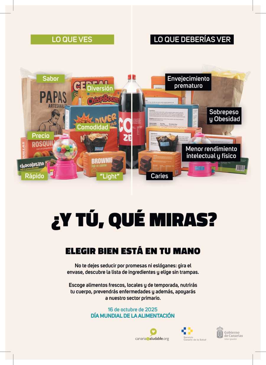 Bajo el lema Y tú, ¿qué miras? Elegir bien está en tu mano, el Gobierno de Canarias ha puesto en marcha una campaña de sensibilización dirigida a toda la población, con el objetivo de fomentar la reflexión sobre la importancia de adoptar hábitos alimentarios saludables y sostenibles. Esta iniciativa pretende promover decisiones conscientes e informadas que impulsen el consumo de alimentos beneficiosos para la salud y respetuosos con el entorno.
