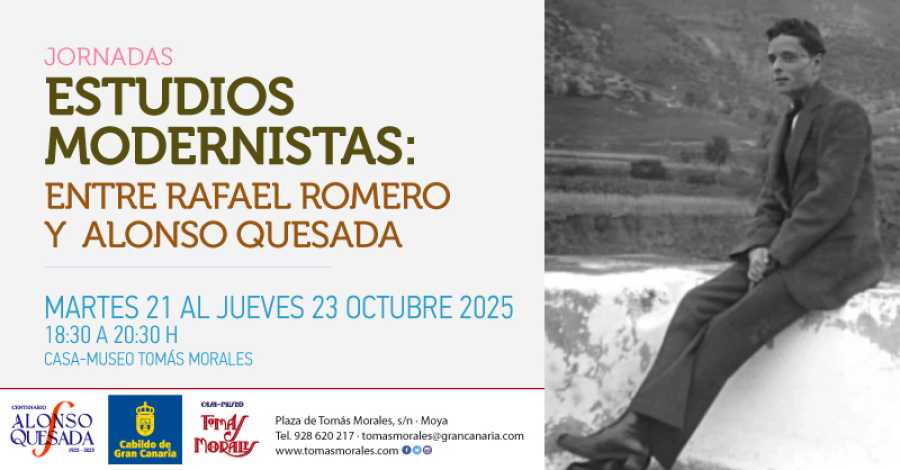 Las Palmas de Gran Canaria, 17 de octubre de 2025.- La Casa-Museo Tomás Morales de Moya acoge, del 21 al 23 de octubre, las jornadas ‘Estudios modernistas: entre Rafael Romero y Alonso Quesada’, que se incluye en la programación impulsada por la Consejería de Cultura con motivo del centenario del citado autor. En ellas se analizarán las diversas etapas artísticas de Quesada, así como de autores coetáneos y el contexto histórico y literario que vivió. Las jornadas tendrán lugar en un horario de 18:30 a 20:30 horas.