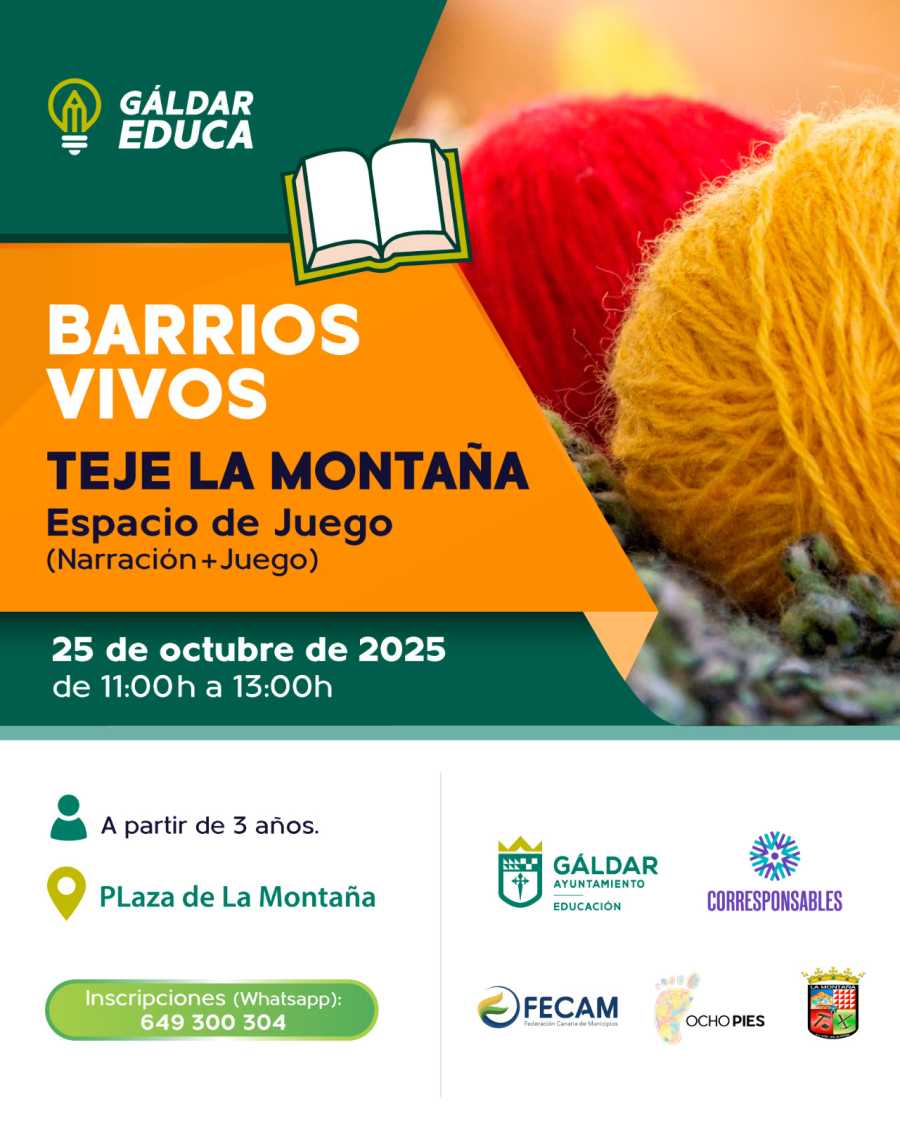 ‘Barrios Vivos’ es una actividad organizada por la Concejalía de Educación dentro del programa Gáldar Educa, con el objetivo de dinamizar la vida de los barrios del municipio. Esta iniciativa se desarrolla en el marco del Plan Corresponsables, con la colaboración de la FECAM, Ocho Pies y el Ayuntamiento de Gáldar.