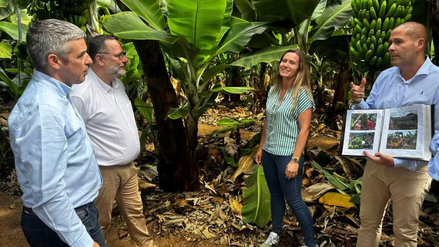 Acompañados por el alcalde de Arucas, Juan Jesús Facundo, y los concejales de Servicios Públicos y Agricultura, José Lorenzo Montesdeoca, de Presidencia y Promoción Económica, Oliver Armas; y de Urbanismo, Sebastián Guerra, los miembros del Ejecutivo regional recorrieron junto a los impulsores de la iniciativa, Rubén García y Katleen Van den Bosch, esta finca donde confluyen la actividad agrícola con la elaboración de productos agroalimentarios y artículos de artesanía a base de fibra de plátano en una instalación pionera en economía circular basada en uno de los cultivo más representativo del archipiélago.