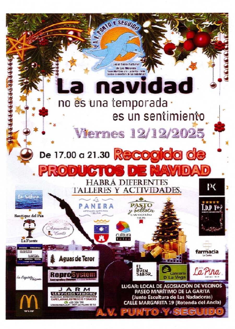 Telde, a 11 de diciembre de 2025. La Asociación de Vecinos Punto y Seguido, del barrio costero de La Garita, invita a la ciudadanía a participar, este viernes 13 de diciembre, de 16.30 a 22.30 horas, en la sede del colectivo -Paseo Marítimo sin número, junto a la escultura de las nadadoras-, en su tradicional evento solidario de recogida de productos navideños.