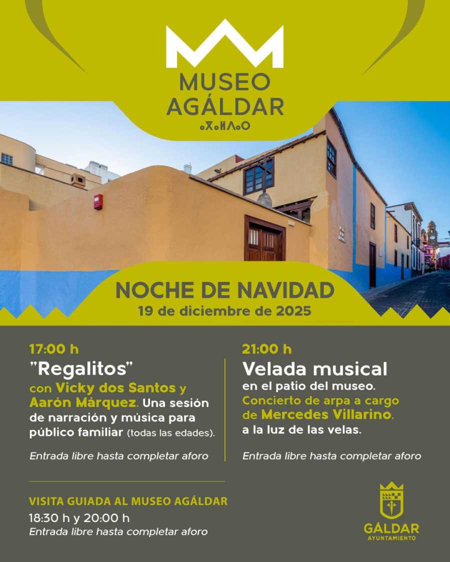 El Museo Agáldar de Historia de la Ciudad se suma al programa Gáldar Ciudad Navidad con su tradicional “Noche de Navidad” este viernes 19 de diciembre. Una jornada cultural pensada para toda la familia, donde el espíritu navideño cobra vida a través de música, cuentos y visitas guiadas en el corazón histórico de la villa.