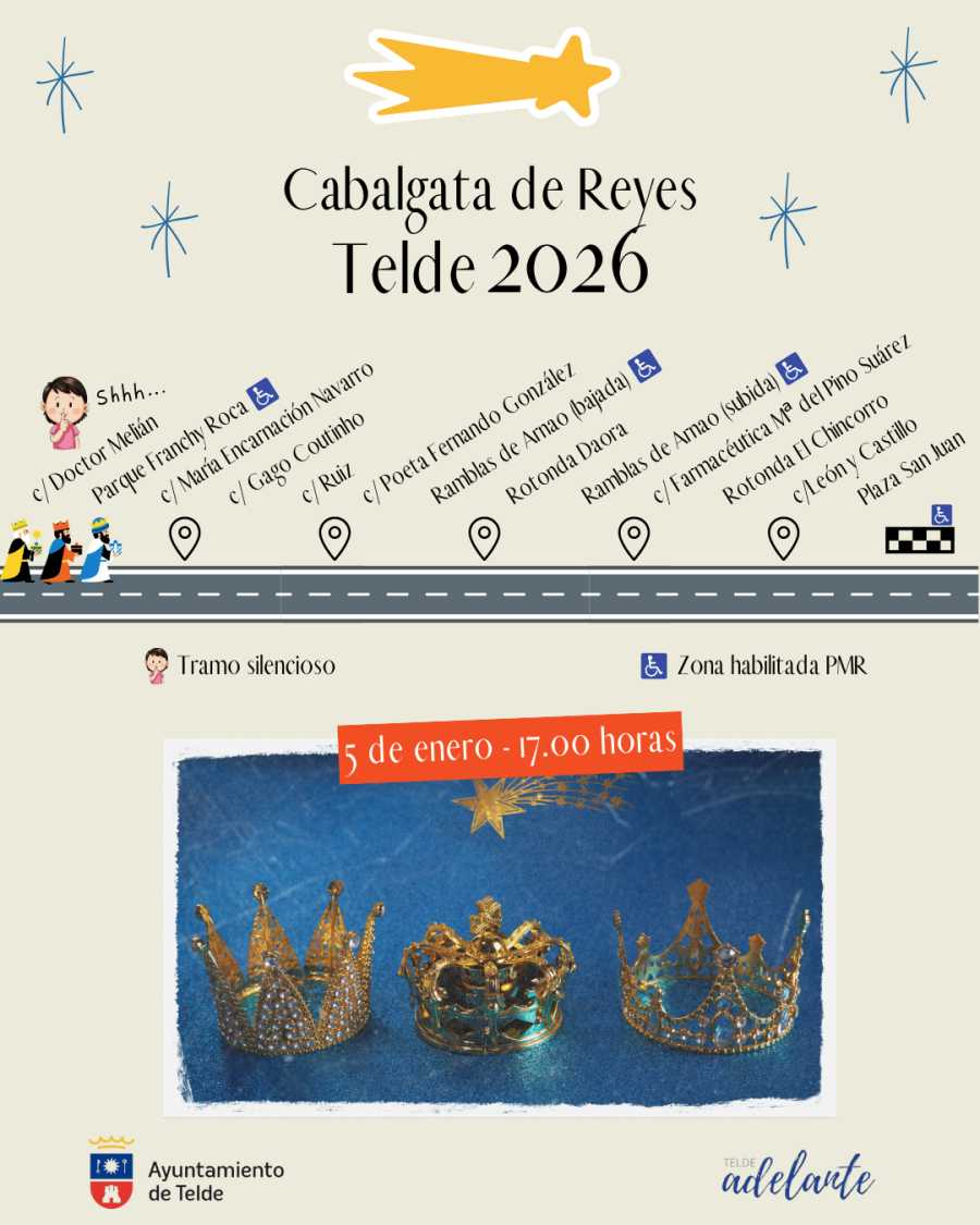 La Cabalgata partirá a las 17.00 horas desde la calle Doctor Melián, donde se ubicará el tramo sin ruidos, dedicado a niños y niñas con Trastorno del Espectro Autista (TEA), o a personas con hipersensibilidad a los ruidos y estruendos o con otro tipo de discapacidad. La comitiva seguirá su ruta por el Parque Franchy Roca, un punto emblemático de encuentro para las familias teldenses, y recorrerá las calles María Encarnación Navarro, Gago Coutinho, Ruiz, Poeta Fernando González, Ramblas de Arnao, Rotonda Daora, Rambla de Arnao, Farmacia María del Pino Suárez, Rotonda El Chorrillo y León y Castillo, hasta culminar en la Plaza de San Juan. El diseño del desfile ha sido elaborado cuidadosamente para ofrecer un flujo dinámico y visualmente impactante en cada tramo.