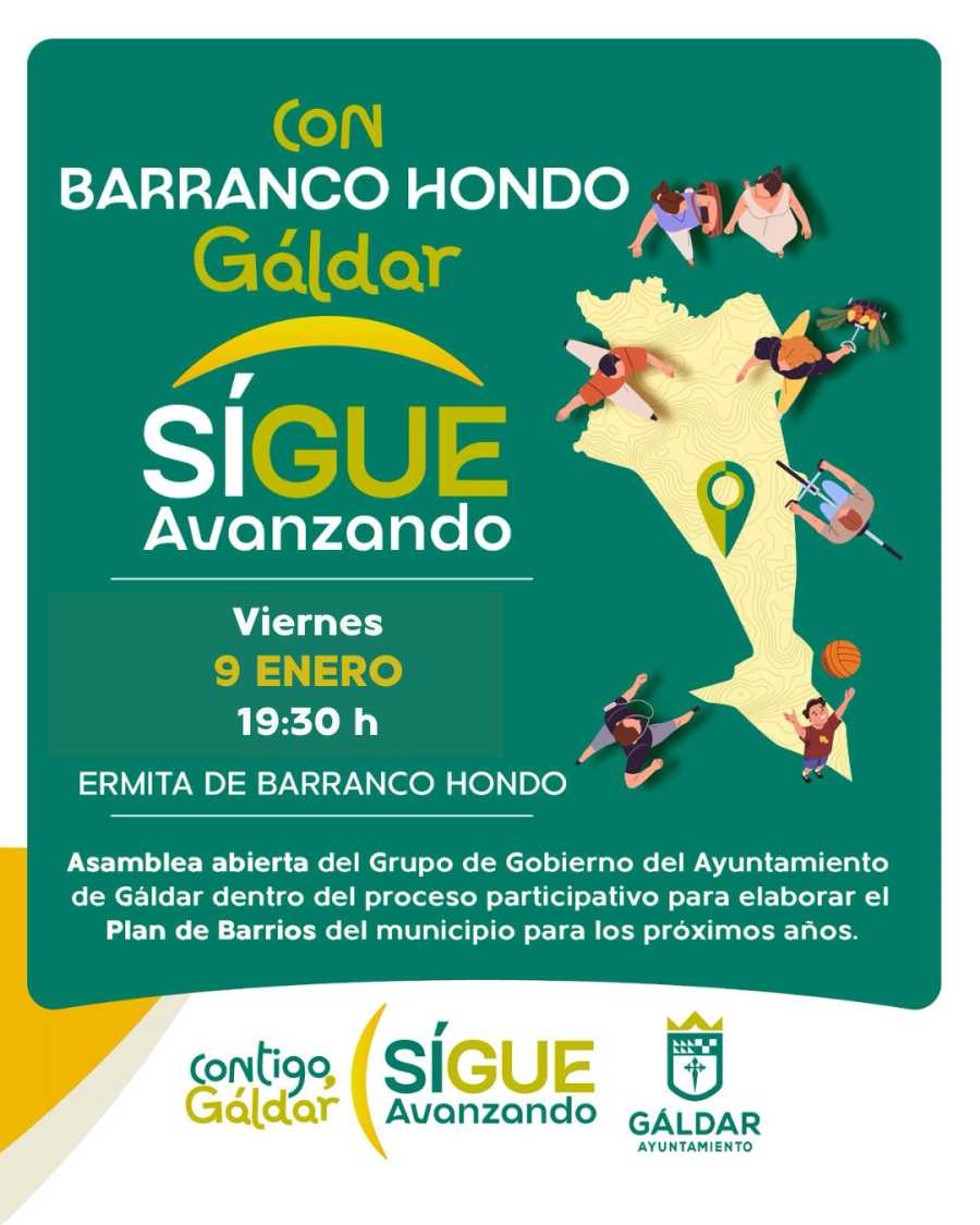 Gáldar continúa su recorrido participativo en Barranco Hondo, cuarta parada del itinerario “Contigo, Gáldar Sigue Avanzando”, con la celebración de la asamblea vecinal este viernes 9 de enero, a las 19:30 horas, en la Ermita de Barranco Hondo, adelantando la fecha respecto a la inicialmente prevista para el sábado, 10 de enero.